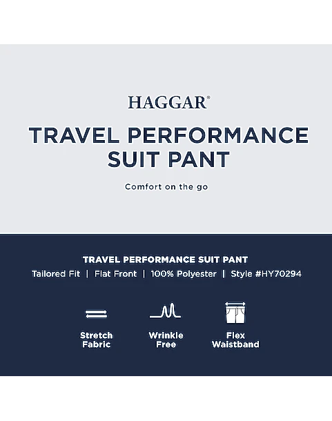 Designed for the busy jet-setter who needs to move with ease, these Haggar Travel Performance suit separates pants are moisture wicking with wrinkle-free fabric and ample stretch. They feature a hidden, flex waistband and smooth, flat front for a contemporary look and comfortable feel. Suit separates let you select coat, pant, and vest sizes independently for an ideal fit.