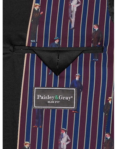 - 64% polyester — 34% rayon — 2% spandex|Peak lapel|One-button closure|Slim Fit|Paisley & Gray|