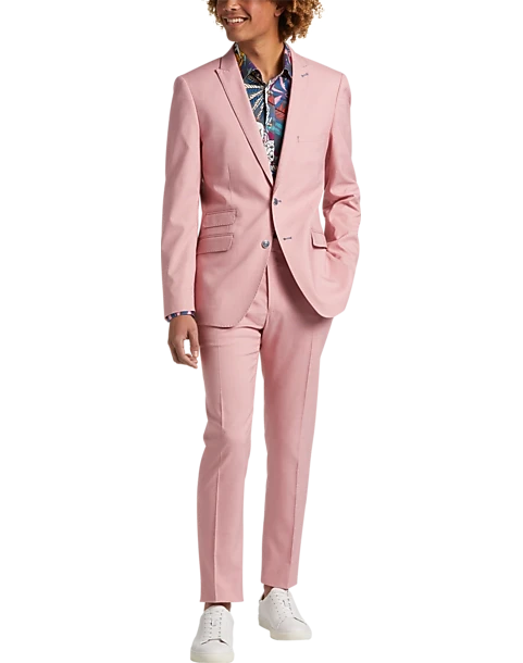 - 64% polyester 34% rayon 2% spandex|Two button|Peak lapel|Side vents|Ticket pocket|Coordinating pieces sold separately|Slim Fit|Paisley & Gray|