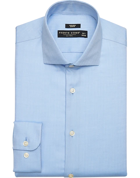 With a Slim Fit for a trim look that leans more modern, this dress shirt from Pronto Uomo offers the added convenience of a non-iron finish to put wrinkles in their place. Slim Fit is slim and tapered across the chest, shoulders, armholes, waist and sleeves without compromising on comfort. Recommended for more triangle body types (broad shoulder and chest, narrow waist and hips).